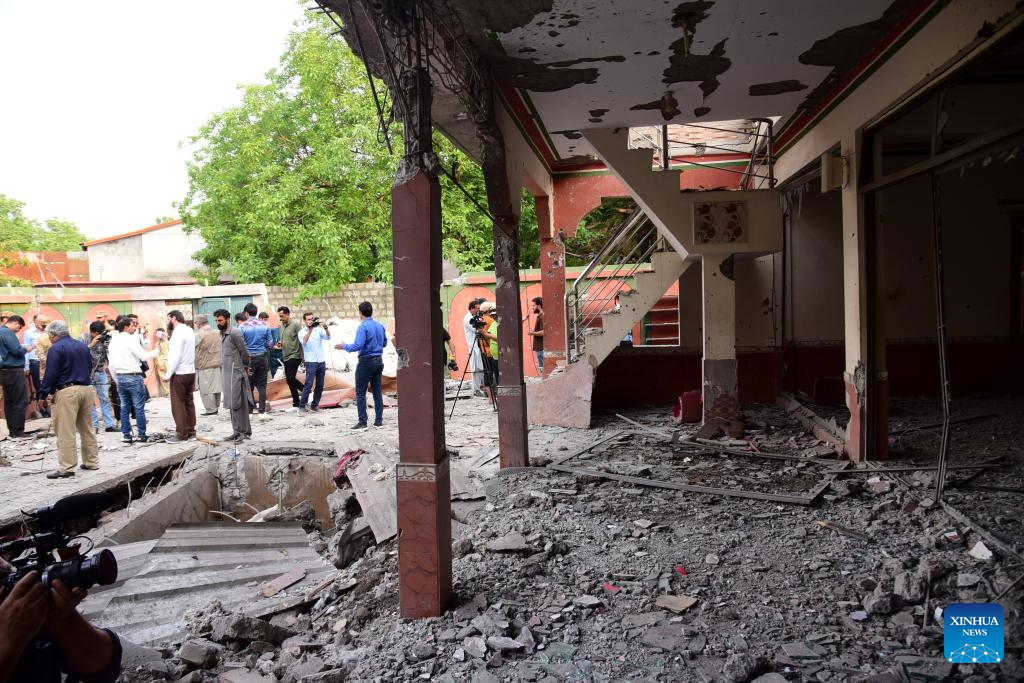 Photo taken on May 7, 2025 shows a building damaged in an Indian missile attack in Muzaffarabad, Pakistan-controlled Kashmir. Twenty-six people, including women and children, were killed and 46 others injured when India attacked civilian settlements in six areas of Pakistan on Tuesday night and Wednesday morning, a spokesperson for the Pakistani army's media wing said. (Photo by Muhammad Din Mughal/Xinhua)