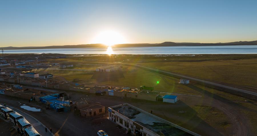 A drone photo taken on July 12, 2022 shows early morning scenery of the countryside in Doima Township of Shuanghu County of Nagqu City, southwest China's Xizang Autonomous Region. (Xinhua/Jigme Dorje)