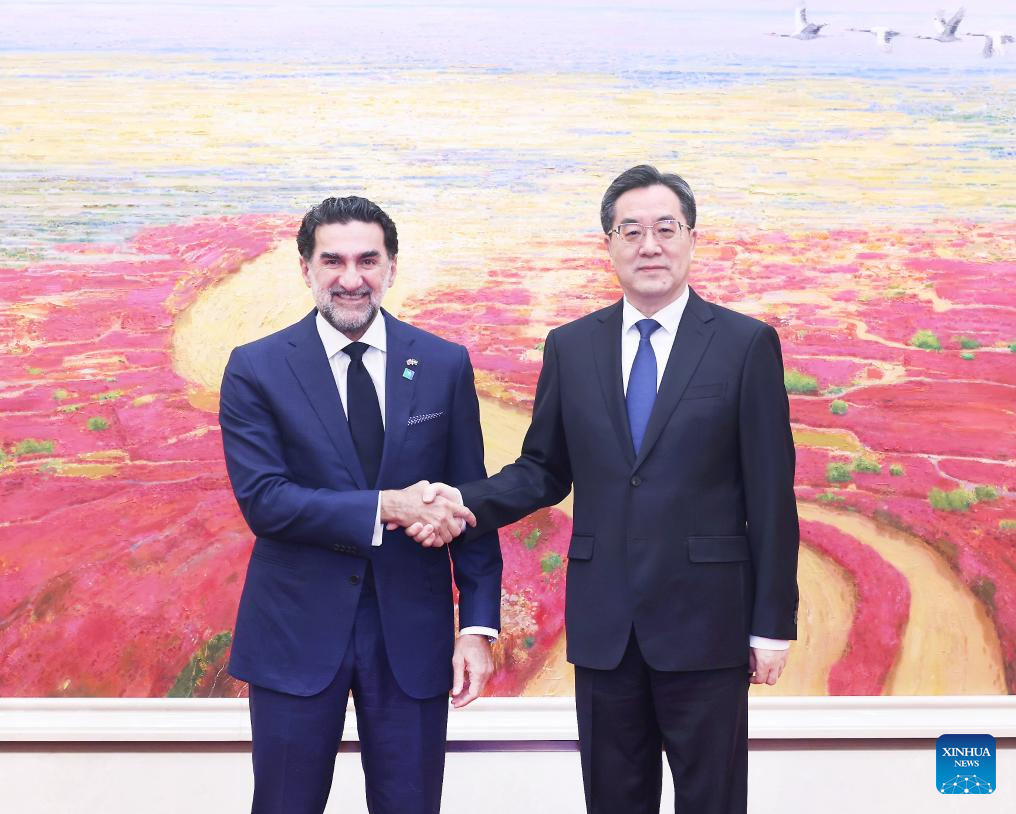 Chinese Vice Premier Ding Xuexiang, also a member of the Standing Committee of the Political Bureau of the Communist Party of China Central Committee, meets with Yasir Al-Rumayyan, chairman of the board of directors of Saudi Aramco, in Beijing, capital of China, May 8, 2025. (Xinhua/Liu Weibing)