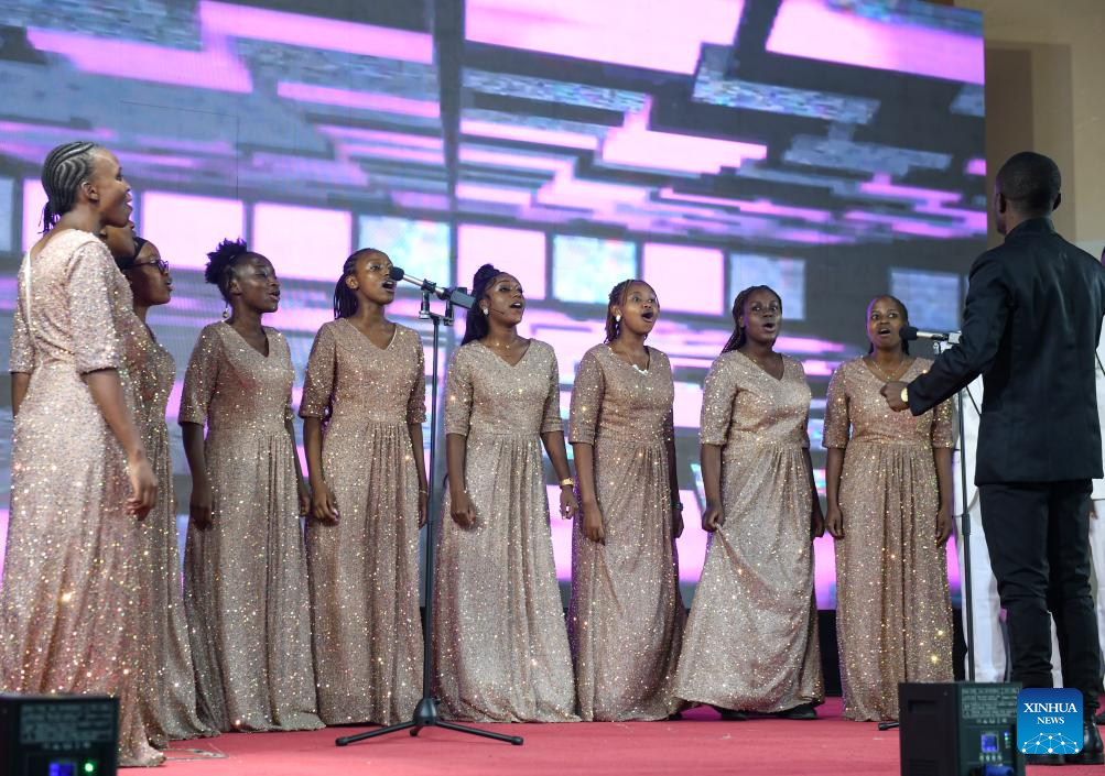 Singers stage a choral performance during the 24th Chinese Bridge-Chinese Proficiency Competition for College Students at the University of Nairobi in Nairobi, Kenya, May 7, 2025. Kenya on Wednesday held the 24th Chinese Bridge-Chinese Proficiency Competition for College Students at the country's oldest university, the University of Nairobi, under the theme of "One World, One Family." (Xinhua/Li Yahui)