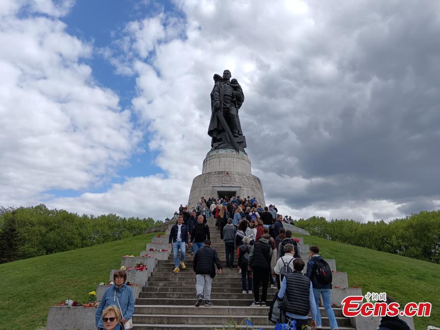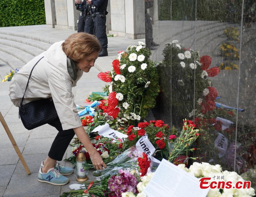 People in Berlin lay flowers to mark the 80th anniversary of the end of World War II in Europe, May 8, 2025. (China News Service/Ma Xiuxiu)