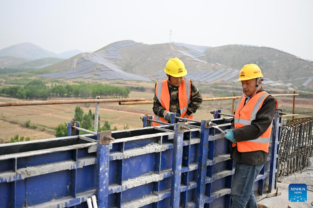 Laborers work at a grand bridge construction site of the Hebei section of Xiong'an-Xinzhou high-speed railway in north China's Hebei Province, May 8, 2025. The Xiong'an-Xinzhou high-speed railway is an important section of Beijing-Kunming high-speed railway that belongs to a greater high-speed rail artery network consisting eight vertical lines and eight horizontal lines in the country.