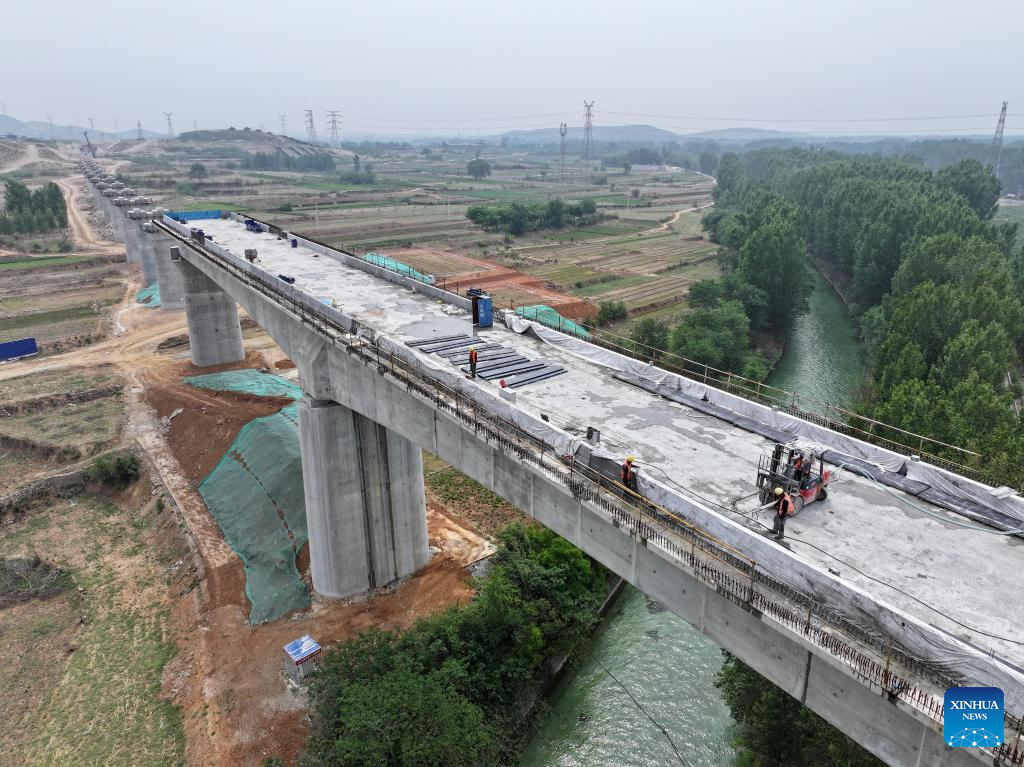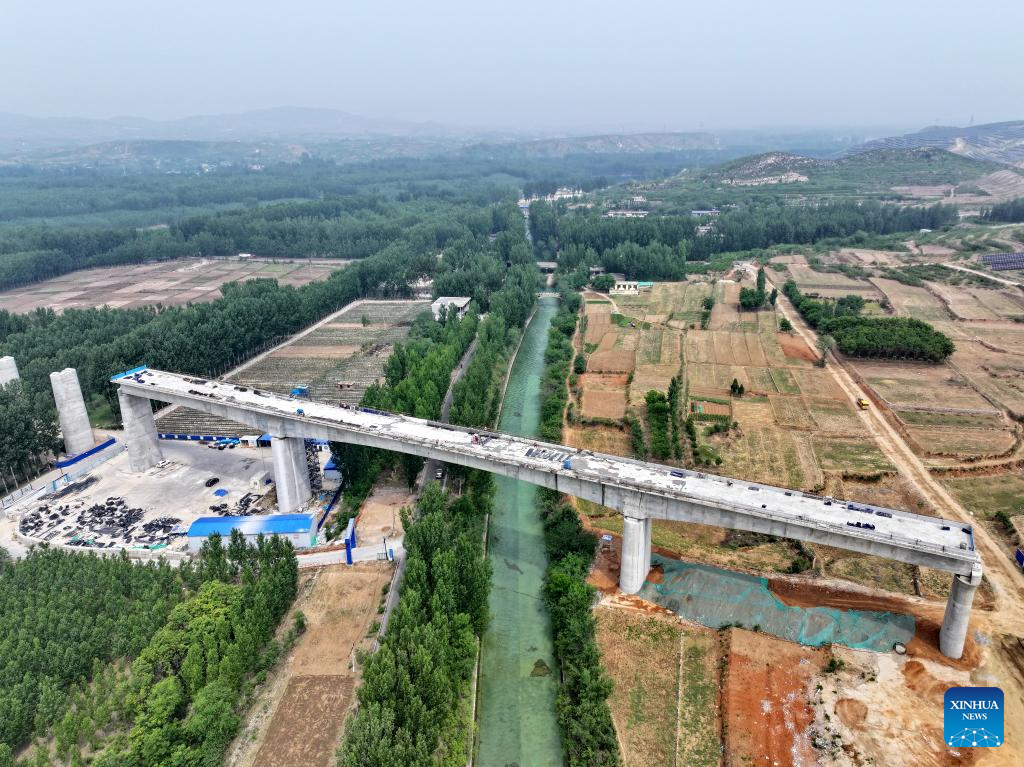 An aerial drone photo taken on May 8, 2025 shows the construction site of the Hebei section of Xiong'an-Xinzhou high-speed railway in north China's Hebei Province. The Xiong'an-Xinzhou high-speed railway is an important section of Beijing-Kunming high-speed railway that belongs to a greater high-speed rail artery network consisting eight vertical lines and eight horizontal lines in the country.