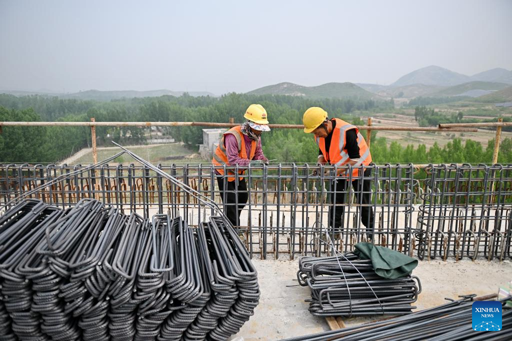 Laborers work at the construction site of the Hebei section of Xiong'an-Xinzhou high-speed railway in north China's Hebei Province, May 8, 2025. The Xiong'an-Xinzhou high-speed railway is an important section of Beijing-Kunming high-speed railway that belongs to a greater high-speed rail artery network consisting eight vertical lines and eight horizontal lines in the country.