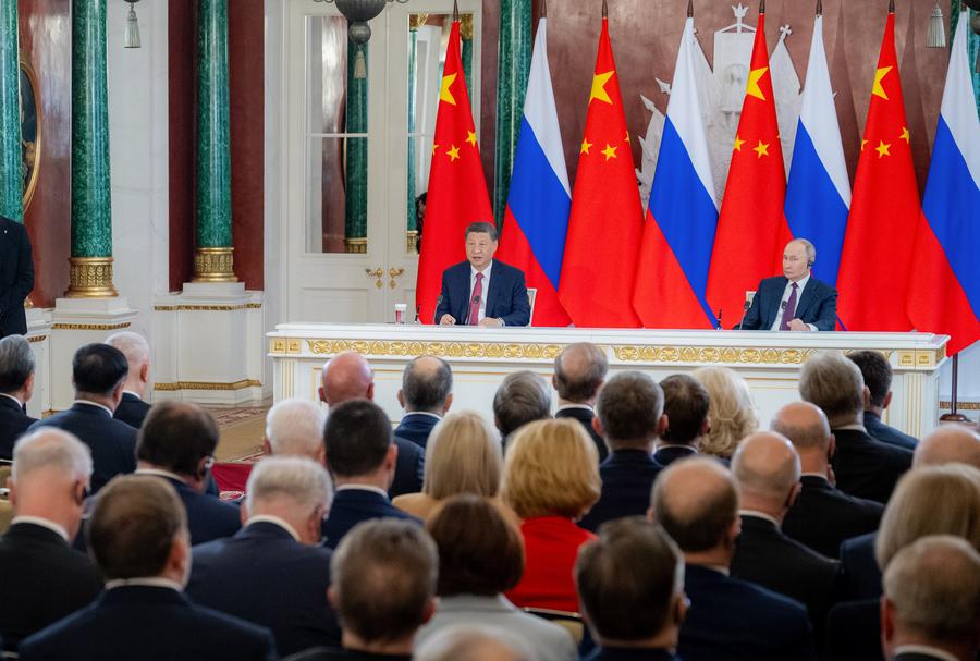 Chinese President Xi Jinping and Russian President Vladimir Putin jointly meet the press after their talks at the Kremlin in Moscow, Russia, May 8, 2025. (Xinhua/Zhai Jianlan)