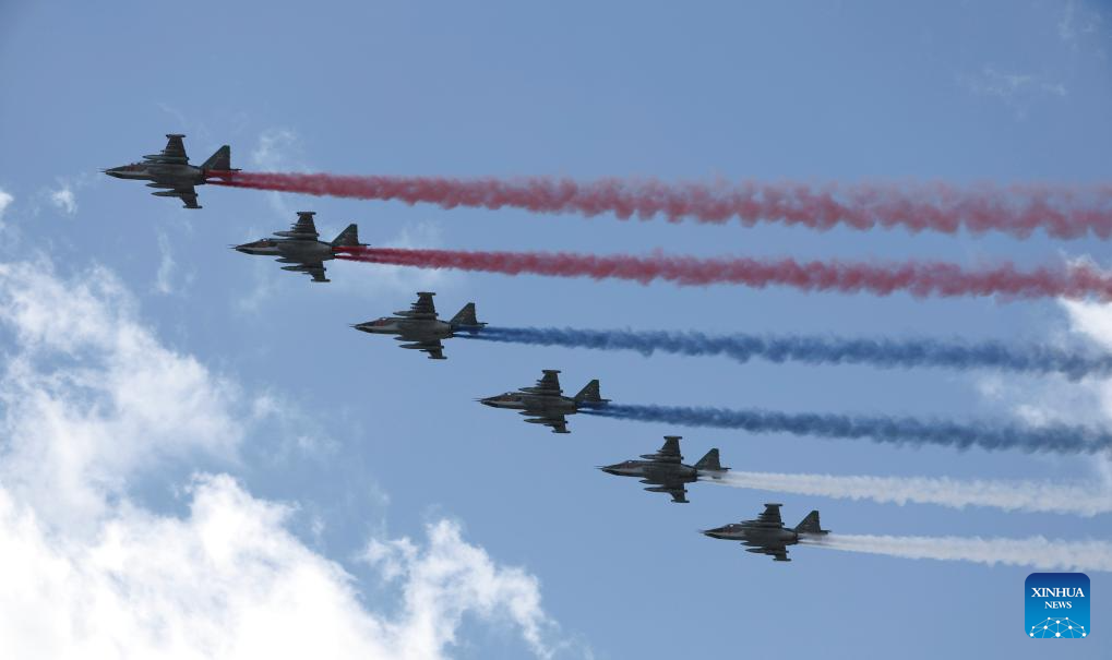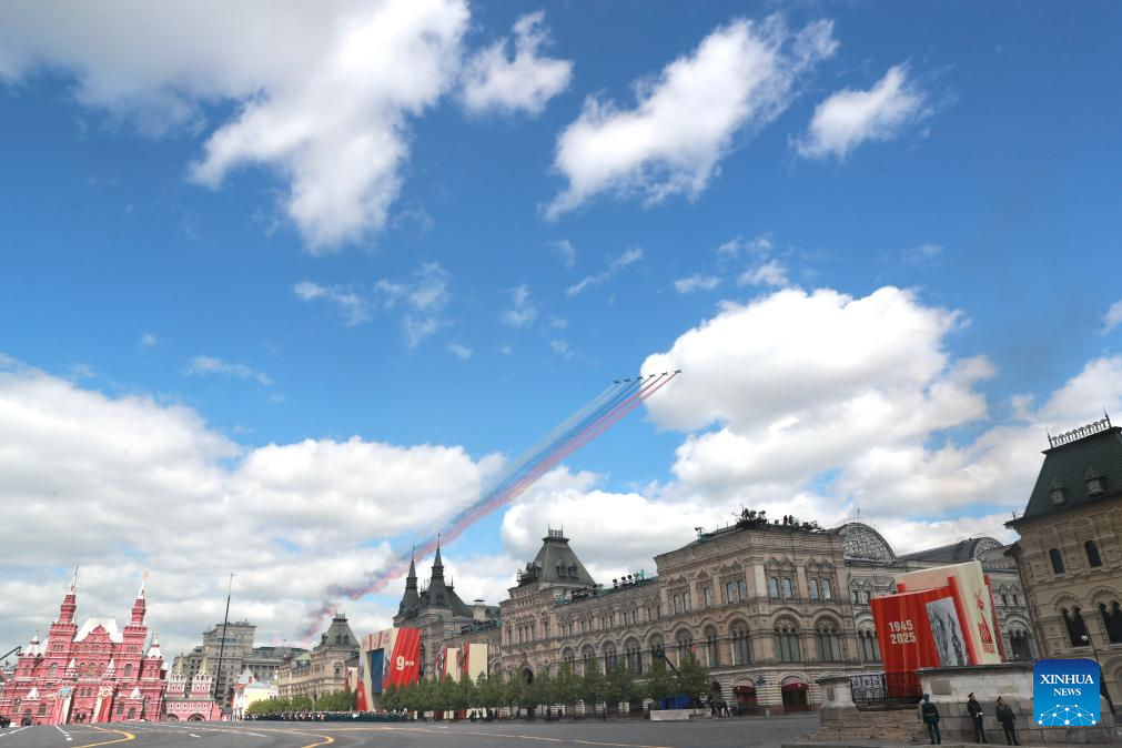 Aircraft fly in formation during a grand parade marking the 80th anniversary of the victory in the Soviet Union's Great Patriotic War in Moscow, Russia, May 9, 2025. (Xinhua/Meng Jing)