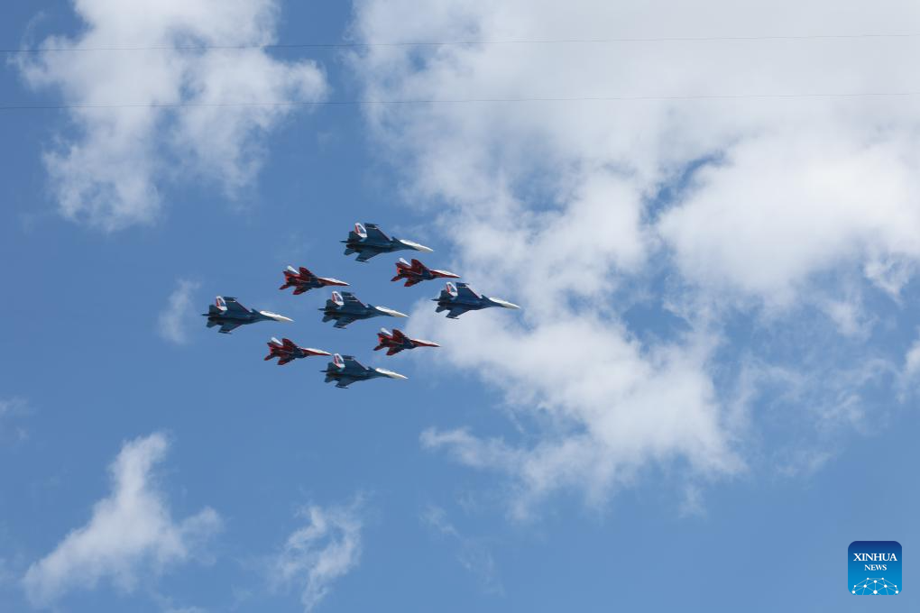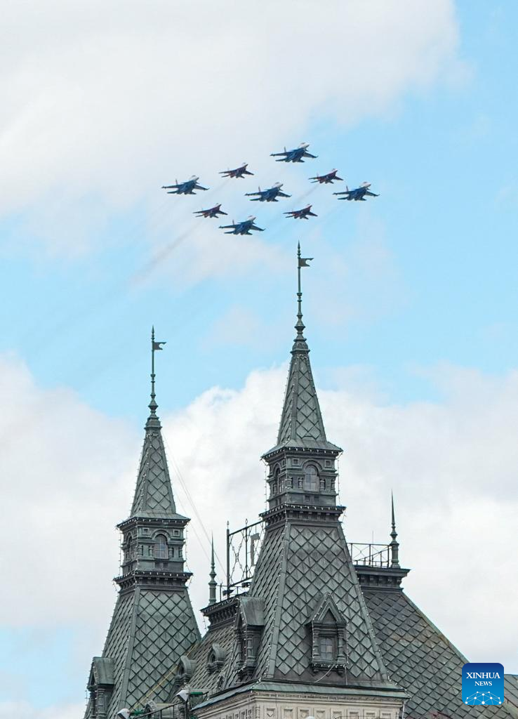 Aircraft fly in formation during a grand parade marking the 80th anniversary of the victory in the Soviet Union's Great Patriotic War in Moscow, Russia, May 9, 2025. (Xinhua/Yao Dawei)
