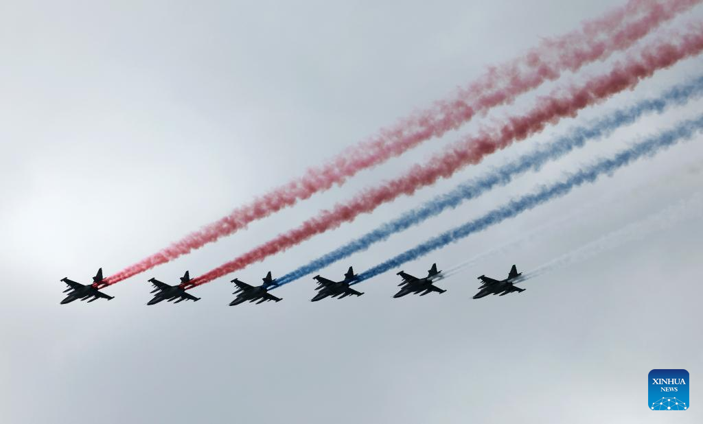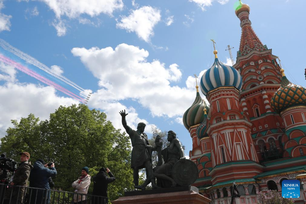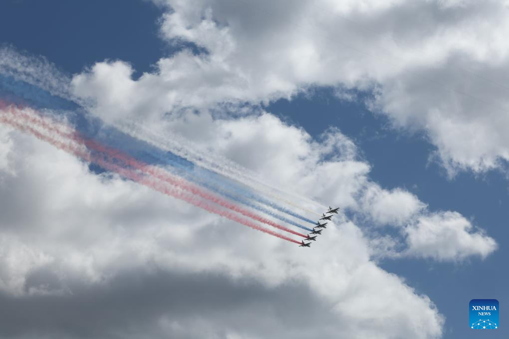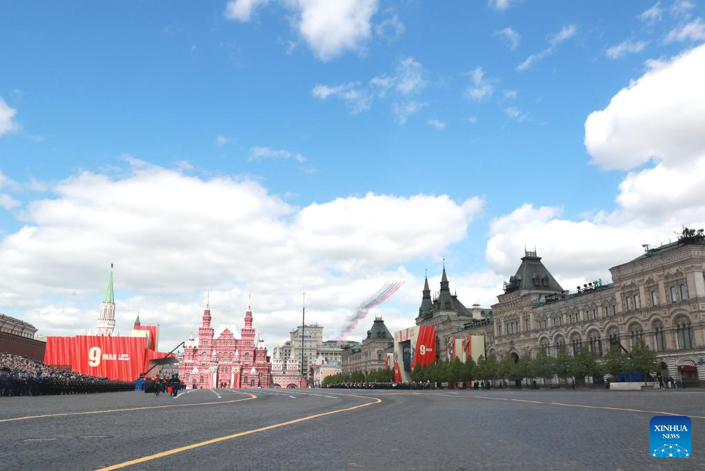 Aircraft fly in formation during a grand parade marking the 80th anniversary of the victory in the Soviet Union's Great Patriotic War in Moscow, Russia, May 9, 2025. (Xinhua/Lai Xiangdong)