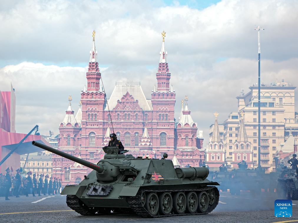 Su-100 armored fighting vehicles march during a grand parade marking the 80th anniversary of the victory in the Soviet Union's Great Patriotic War in Moscow, Russia, May 9, 2025. (Xinhua/Lai Xiangdong)