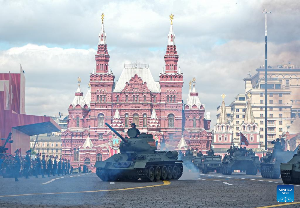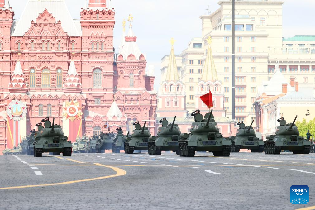 A tank marches during a grand parade marking the 80th anniversary of the victory in the Soviet Union's Great Patriotic War in Moscow, Russia, May 9, 2025. (Xinhua/Lai Xiangdong)
