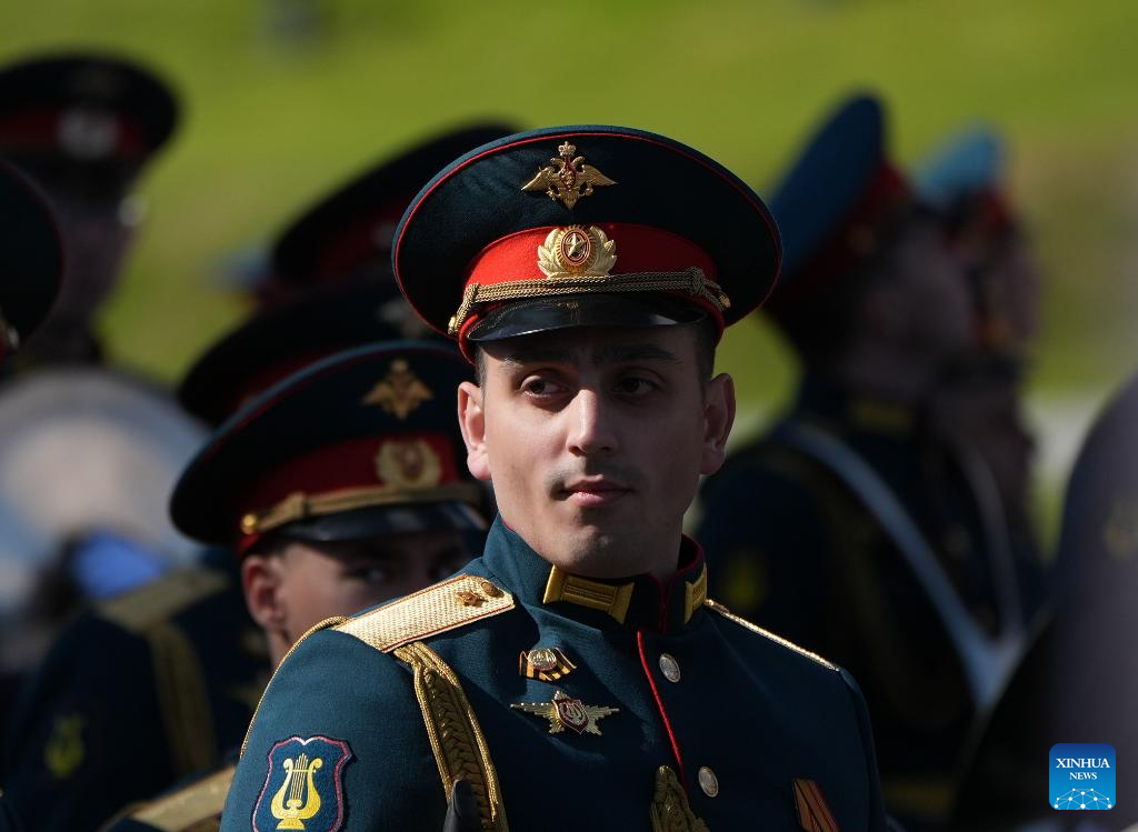 A military band prepares to attend a grand parade marking the 80th anniversary of the victory in the Soviet Union's Great Patriotic War in Moscow, Russia, May 9, 2025. (Xinhua/Bai Xueqi)