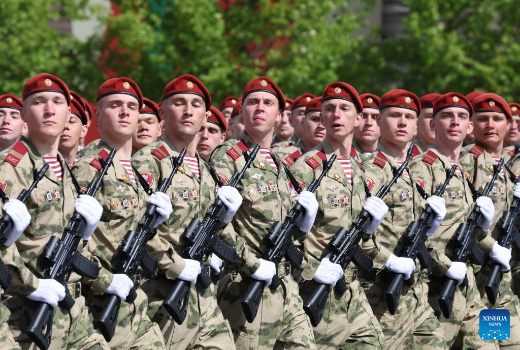 Members of an honor guard attend a grand parade marking the 80th anniversary of the victory in the Soviet Union's Great Patriotic War in Moscow, Russia, May 9, 2025. (Xinhua/Ding Lin)