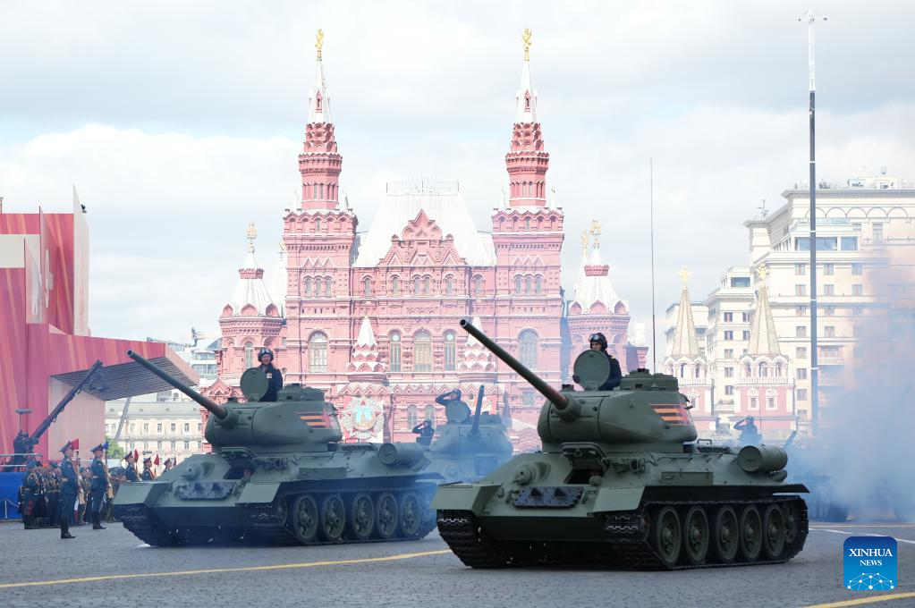 A T-34 tank is pictured during a grand parade marking the 80th anniversary of the victory in the Soviet Union's Great Patriotic War in Moscow, Russia, May 9, 2025. (Xinhua/Lai Xiangdong)