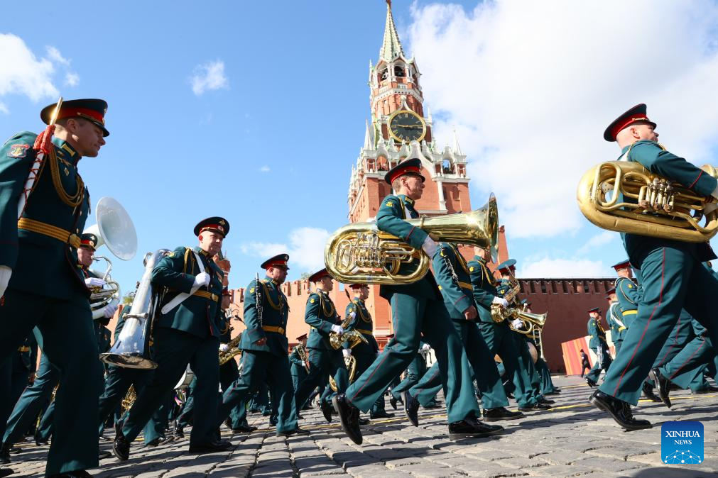 A military band attends a grand parade marking the 80th anniversary of the victory in the Soviet Union's Great Patriotic War in Moscow, Russia, May 9, 2025. (Xinhua/Lai Xiangdong)