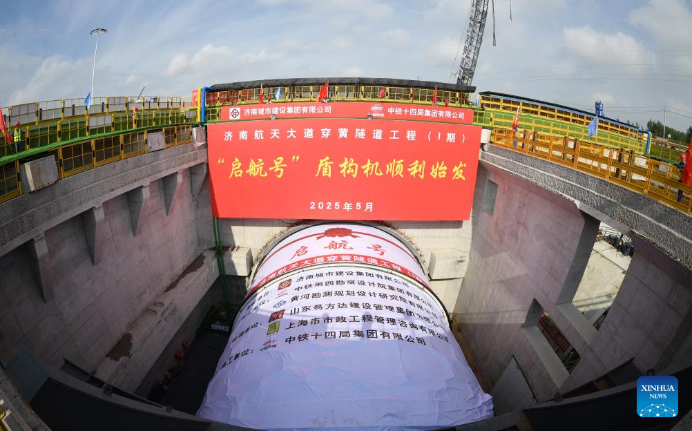 This photo shows "Qihang," a tunnel boring machine deployed for the construction of a Yellow River tunnel in Jinan, east China's Shandong Province, May 9, 2025. A shield machine of the south line of the Yellow River tunnel started boring in Jinan on Friday, with an excavation diameter of 15.06 meters.