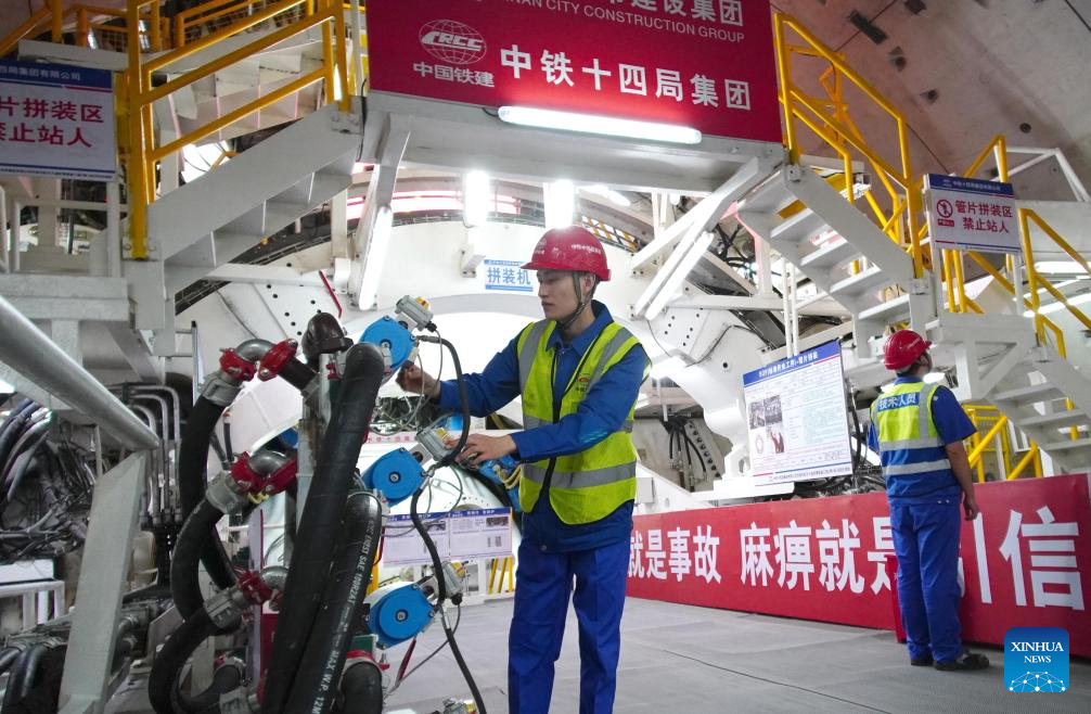 Staff workers work at the construction site of a Yellow River tunnel in Jinan, east China's Shandong Province, May 9, 2025. A shield machine of the south line of the Yellow River tunnel started boring in Jinan on Friday, with an excavation diameter of 15.06 meters.