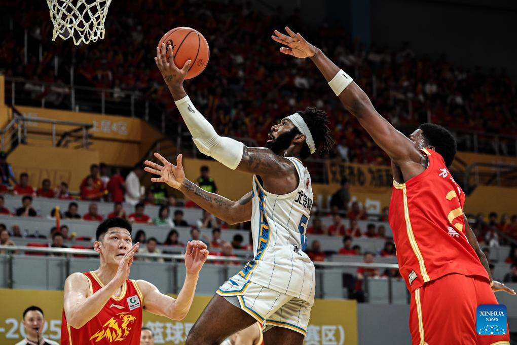 Eugene German (C) of Beijing Ducks goes for a layup during the playoff final 2nd round match between Zhejiang Lions and Beijing Ducks at the 2024-2025 season of the Chinese Basketball Association (CBA) league in Hangzhou, east China's Zhejiang Province, May 9, 2025. (Xinhua/Jiang Han)