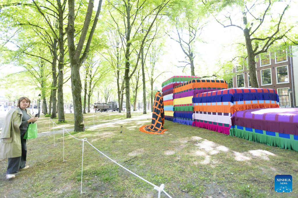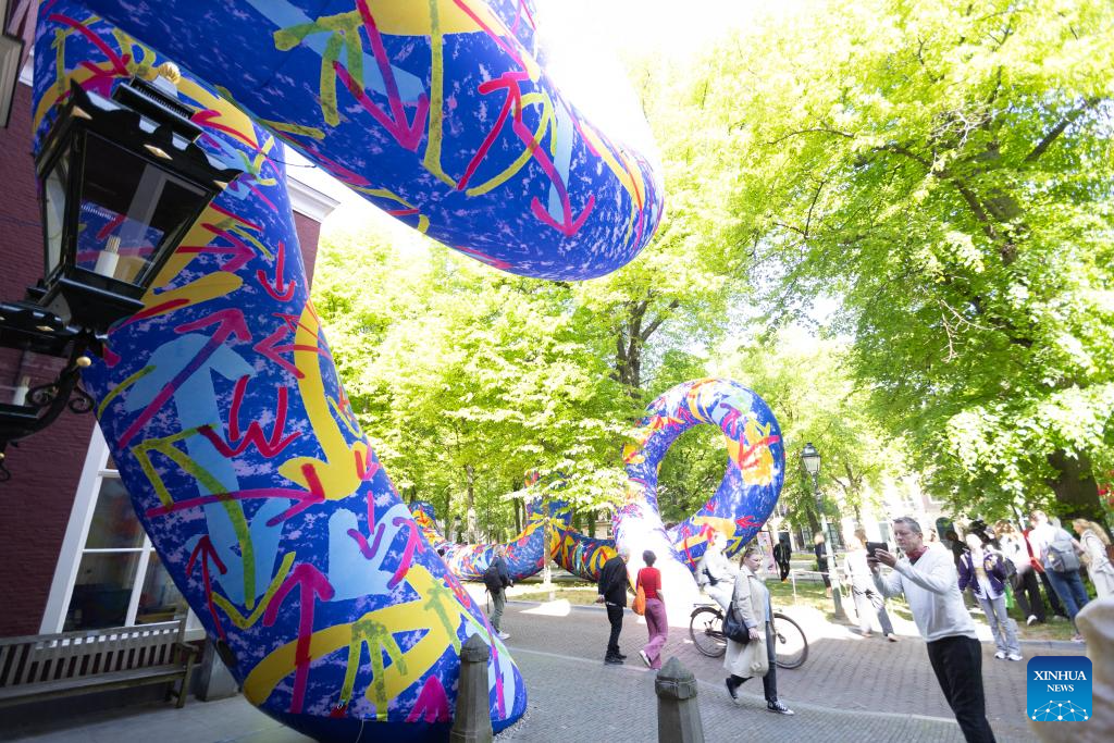 Visitors view an artwork during the BlowUp Art exhibition, an open-air display of gigantic inflatable artworks, at the Pulchri Studio in The Hague, the Netherlands, May 9, 2025. The exhibition will last util June 11. (Photo by Sylvia Lederer/Xinhua)