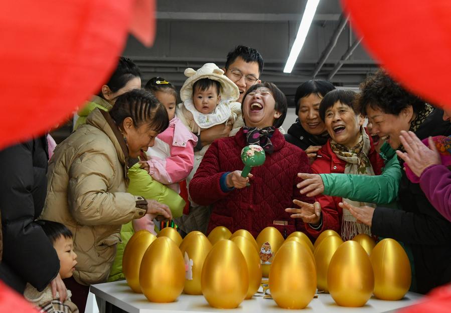 Residents smash "golden eggs" for a prize during a community New Year celebration event in Jinhua, east China's Zhejiang Province, Dec. 30, 2024. (Photo by Shi Kuanbing/Xinhua)