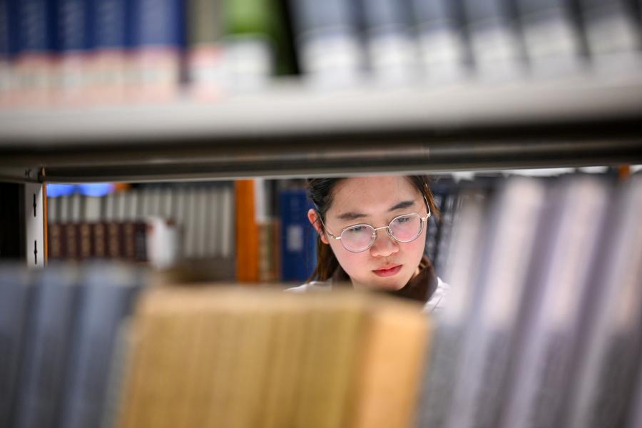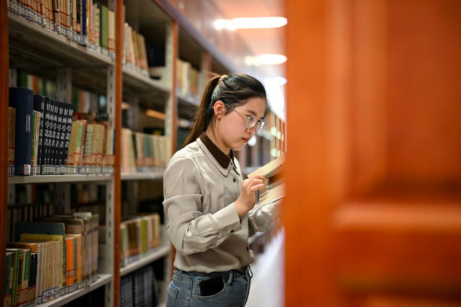 Yang Yali works on her papers at the library of the Jinnan Campus of Nankai University in north China's Tianjin, May 7, 2025. (Xinhua/Li Ran)