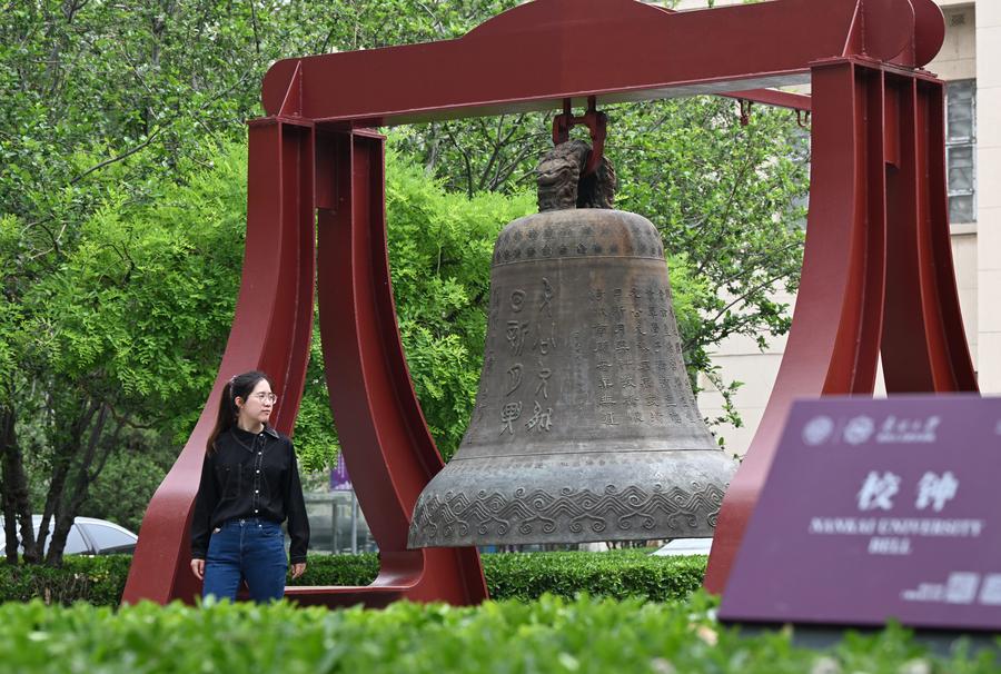 Yang Yali passes by the campus bell at the Balitai Campus of Nankai University in north China's Tianjin, May 8, 2025. (Xinhua/Li Ran)