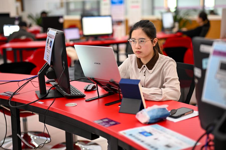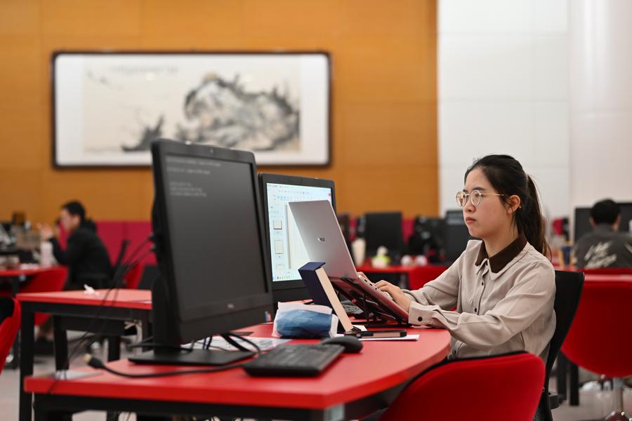 Yang Yali works on her papers at the library of the Jinnan Campus of Nankai University in north China's Tianjin, May 7, 2025. (Xinhua/Zhang Cheng)