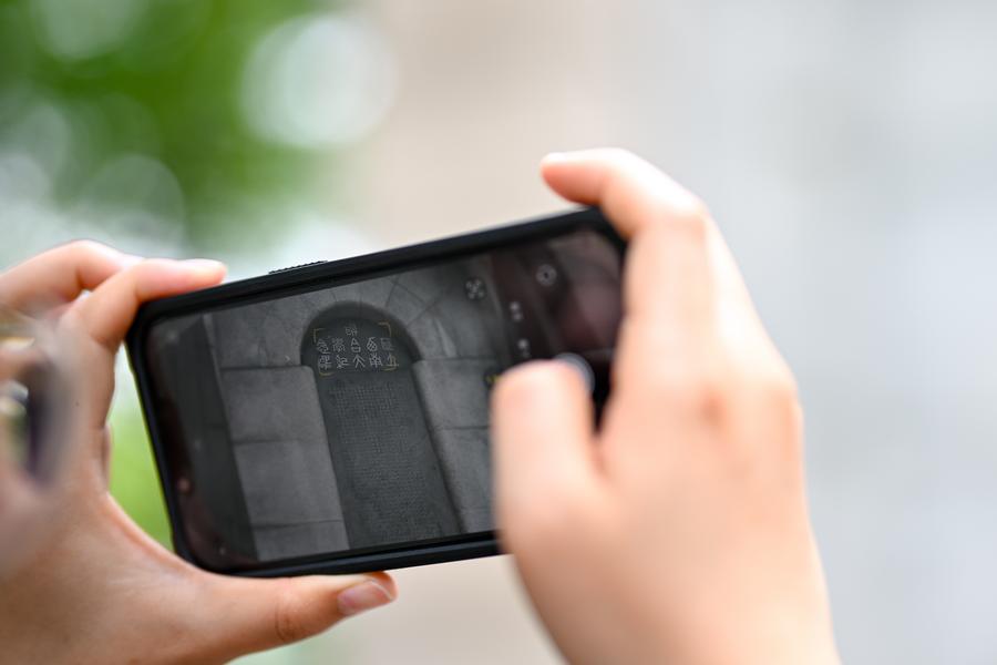 Yang Yali takes a photo of a monument of the National Southwest Associated University at the Balitai Campus of Nankai University in north China's Tianjin, May 8, 2025. (Xinhua/Zhang Cheng)