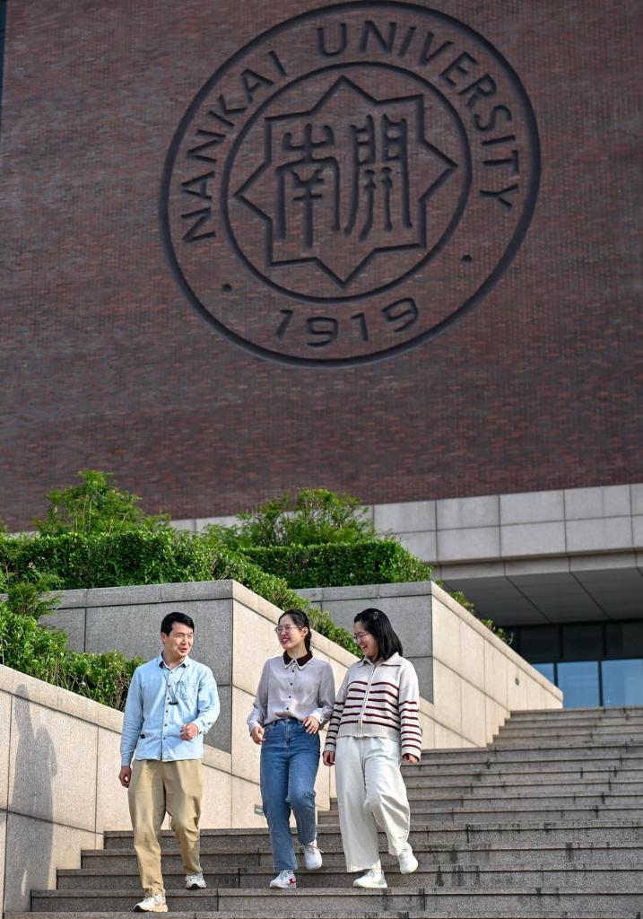 Yang Yali (C) talks with her friends at the Jinnan Campus of Nankai University in north China's Tianjin, May 7, 2025. (Xinhua/Zhang Cheng)