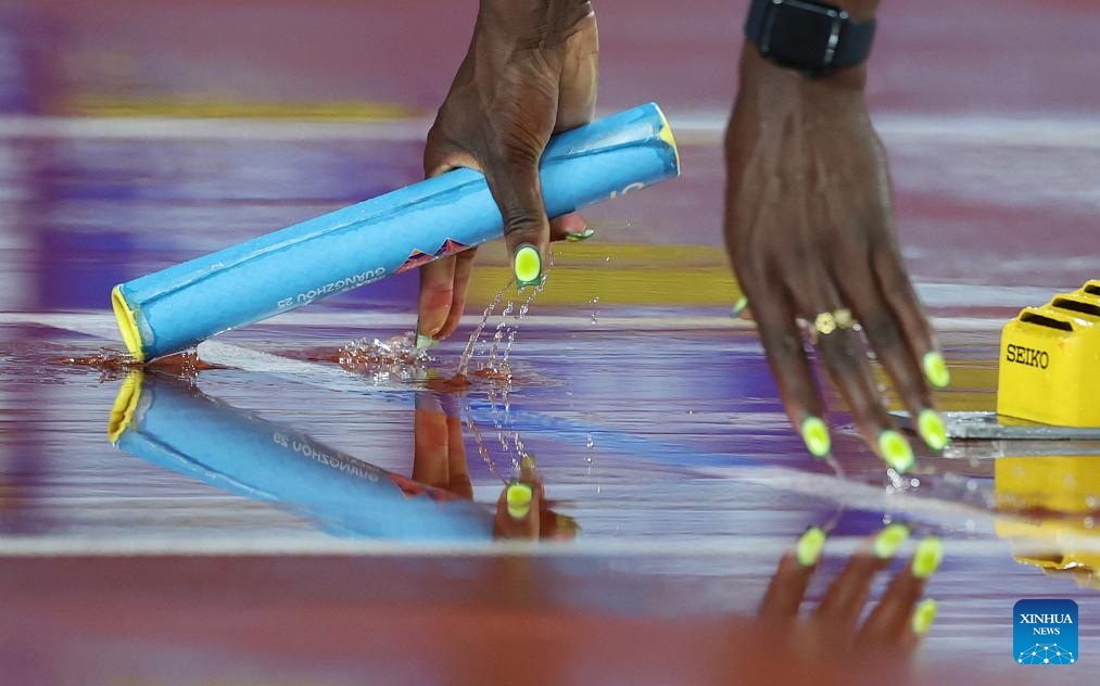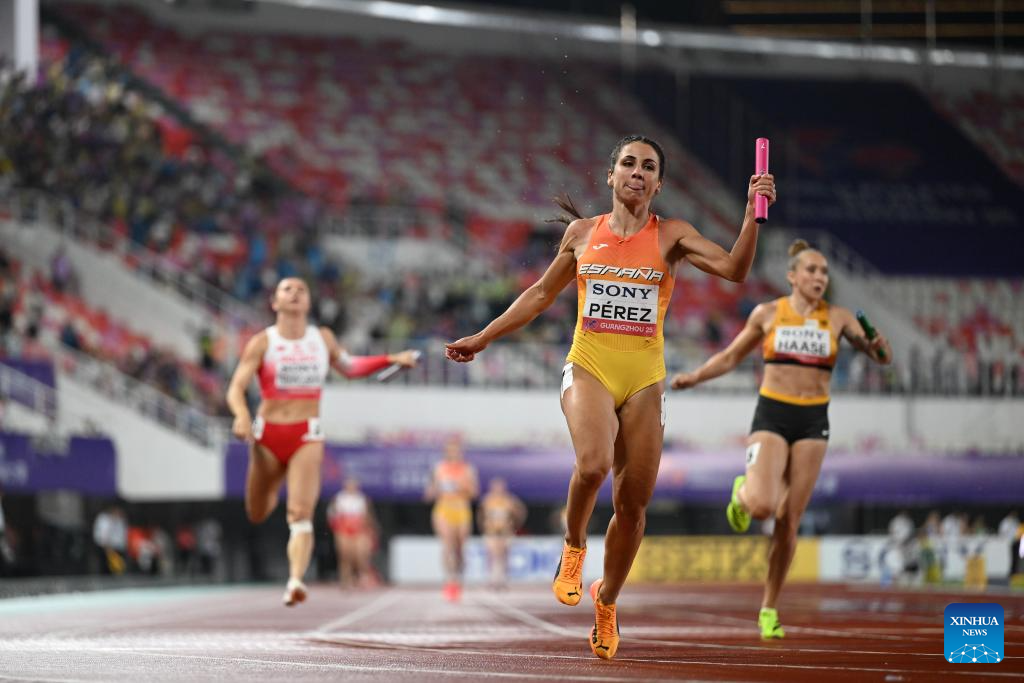 Maria Isabel Perez (C) of Spain competes during the Women's 4x100 Metres Relay qualifying round 1 at the World Athletics Relays Guangzhou 2025 in Guangzhou, south China's Guangdong Province, May 10, 2025. (Xinhua/Song Yanhua)