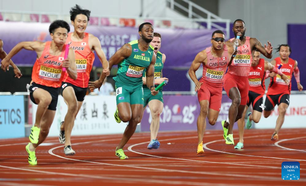 Andre De Grasse (4th R) of team Canada competes during the men's 4x100m relay round 1 at the World Athletics Relays Guangzhou 2025 in Guangzhou, south China's Guangdong Province, May 10, 2025. (Xinhua/Li Ming)