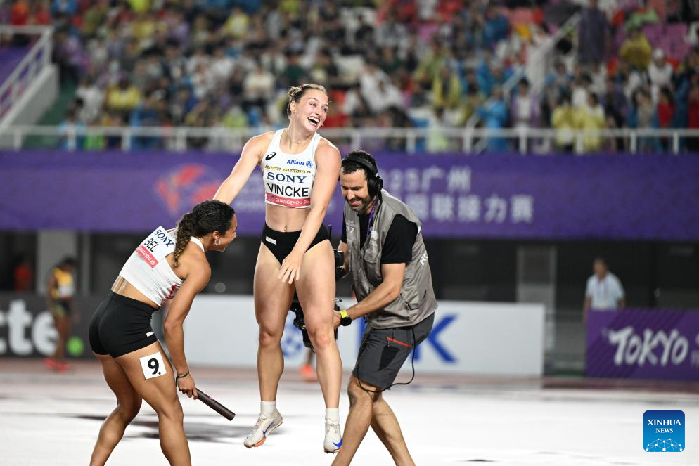 Rani Vincke (C) of Belgium celebrates after the Women's 4x100 Metres Relay qualifying round 1 at the World Athletics Relays Guangzhou 2025 in Guangzhou, south China's Guangdong Province, May 10, 2025. (Xinhua/Song Yanhua)
