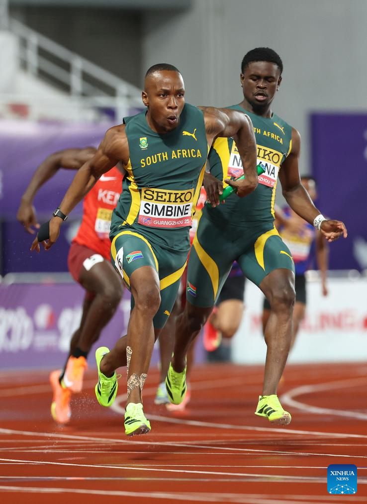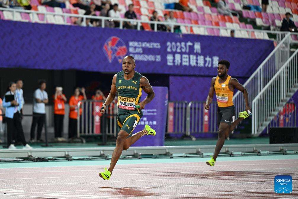 Akani Simbine of South Africa competes during the Men's 4x100 Metres Relay qualifying round 1 at the World Athletics Relays Guangzhou 2025 in Guangzhou, south China's Guangdong Province, May 10, 2025. (Xinhua/Song Yanhua)