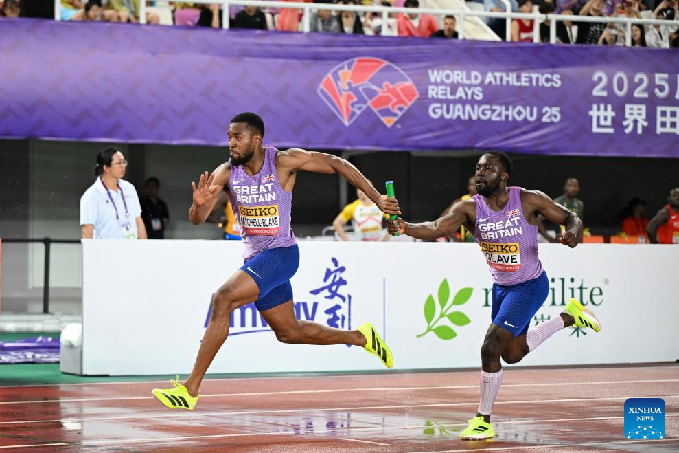 Nethaneel Mitchell-Blake (L) and Romell Glave of Britain compete during the Men's 4x100 Metres Relay qualifying round 1 at the World Athletics Relays Guangzhou 2025 in Guangzhou, south China's Guangdong Province, May 10, 2025. (Xinhua/Song Yanhua)