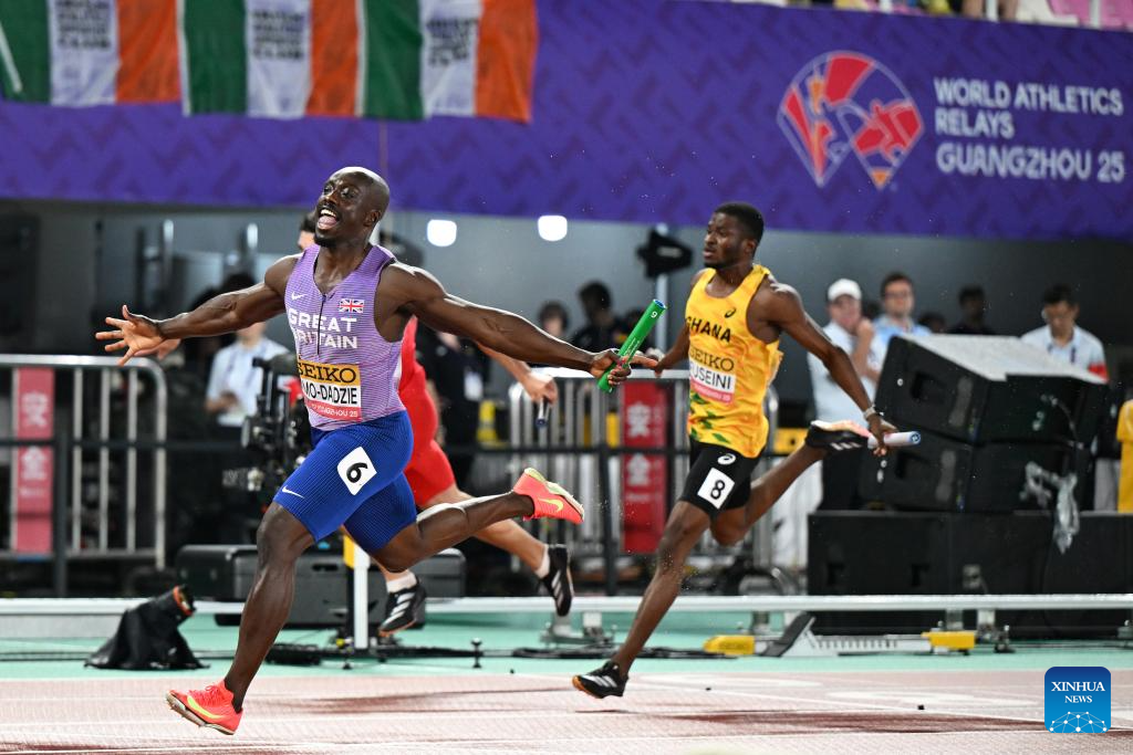 Eugene Amo-Dadzie (L) of Britain competes during the Men's 4x100 Metres Relay qualifying round 1 at the World Athletics Relays Guangzhou 2025 in Guangzhou, south China's Guangdong Province, May 10, 2025. (Xinhua/Song Yanhua)