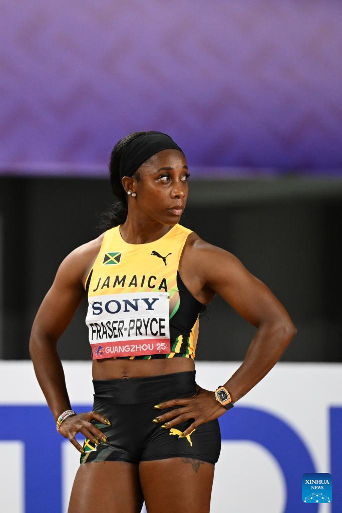 Shelly-Ann Fraser-Pryce of Jamaica reacts before the Women's 4x100 Metres Relay qualifying round 1 at the World Athletics Relays Guangzhou 2025 in Guangzhou, south China's Guangdong Province, May 10, 2025. (Xinhua/Song Yanhua)