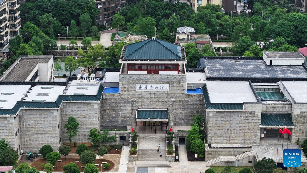 An aerial drone photo shows an exterior view of Yueyang Museum in Yueyang City, central China's Hunan Province, May 10, 2025. Yueyang Museum reopened to the public on Saturday after a temporary closure for renovation of space layout and exhibition area in the museum since Feb. 19, 2025. (Xinhua/Chen Zhenhai)