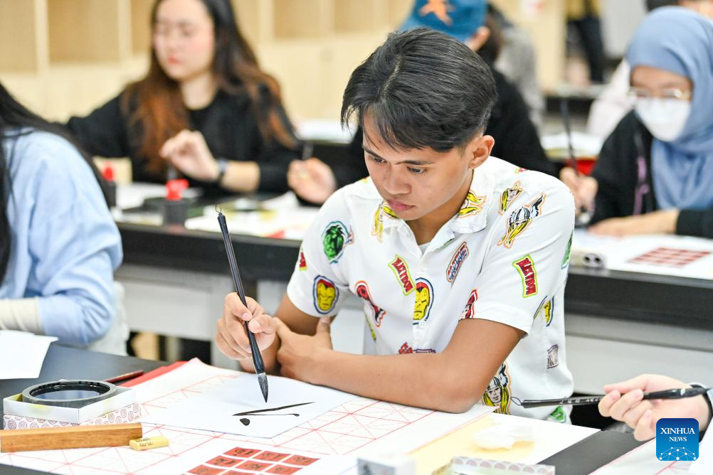 Students from University of Malaysia Sarawak (UNIMAS) practice Chinese calligraphy at Vocational and Technical College of Inner Mongolia Agricultural University in Baotou, north China's Inner Mongolia Autonomous Region, May 9, 2025.
