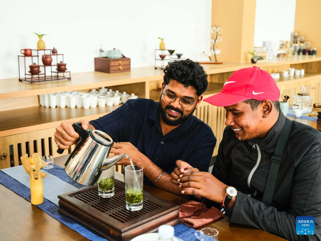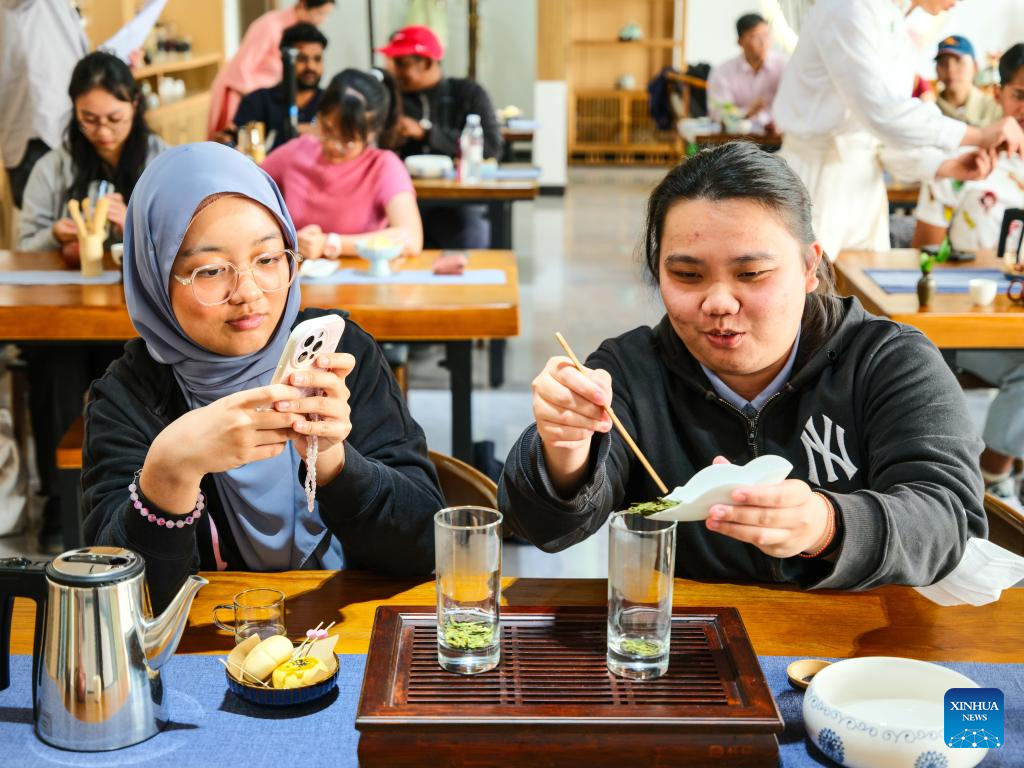 Students from University of Malaysia Sarawak (UNIMAS) learn to make tea at Vocational and Technical College of Inner Mongolia Agricultural University in Baotou, north China's Inner Mongolia Autonomous Region, May 9, 2025.
