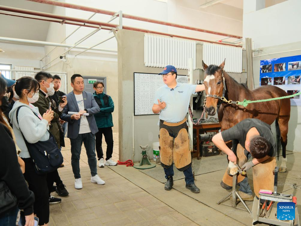 Students from University of Malaysia Sarawak learn to put on horseshoes at Vocational and Technical College of Inner Mongolia Agricultural University (UNIMAS) in Baotou, north China's Inner Mongolia Autonomous Region, May 9, 2025.
