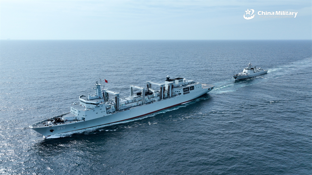 The comprehensive supply ship Hulunhu (Hull 901) attached to a combat support ship flotilla with the navy under the Chinese PLA Northern Theater Command practices astern replenishment-at-sea with the guided-missile destroyer Kaifeng (Hull 124) during a multi-subject training exercise in late April 2025. (eng.chinamil.com.cn/Photo by Xu Taotao)