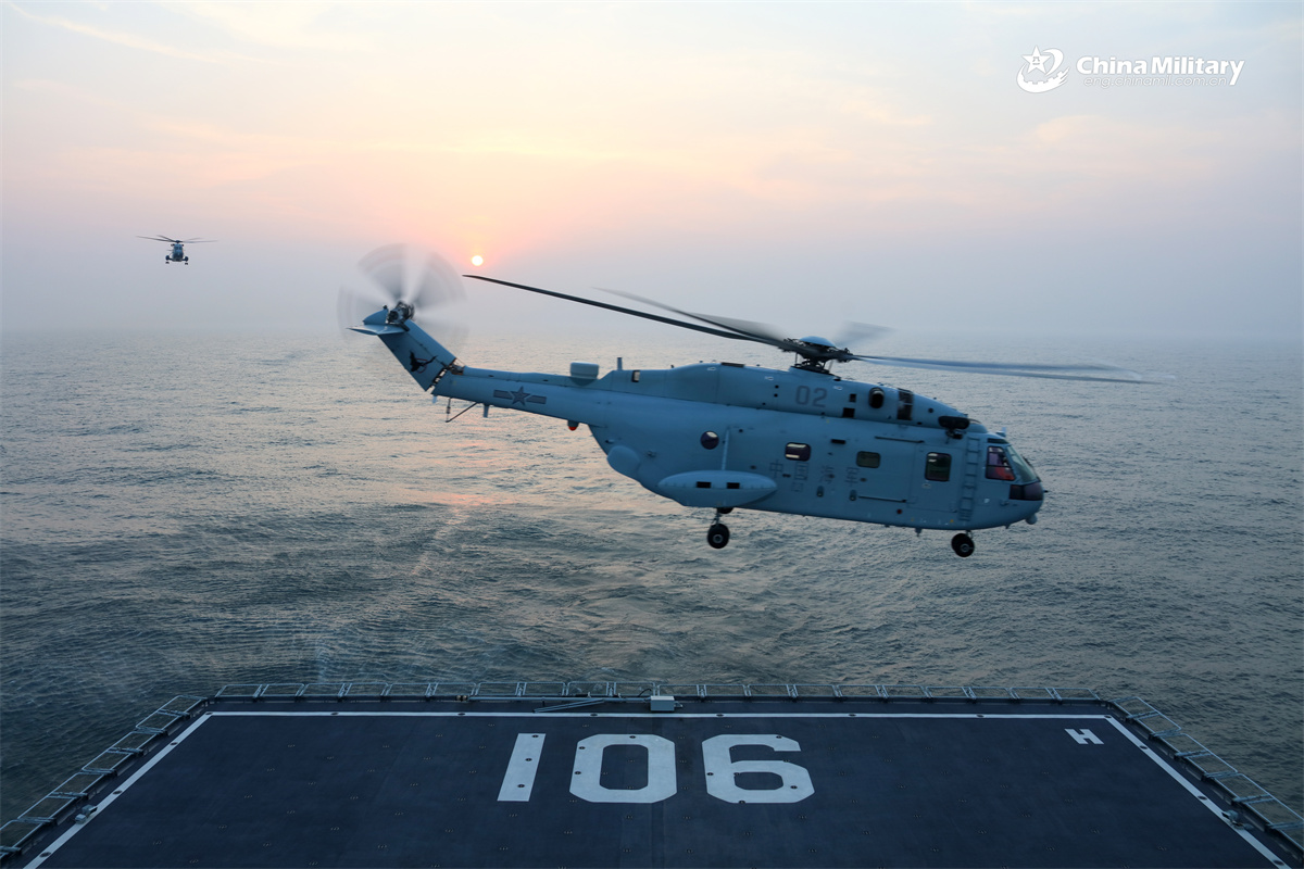 The comprehensive supply ship Hulunhu (Hull 901) attached to a combat support ship flotilla with the navy under the Chinese PLA Northern Theater Command practices tactical coordination with a ship-born helicopter during a multi-subject training exercise in late April 2025. (eng.chinamil.com.cn/Photo by Xu Taotao)
