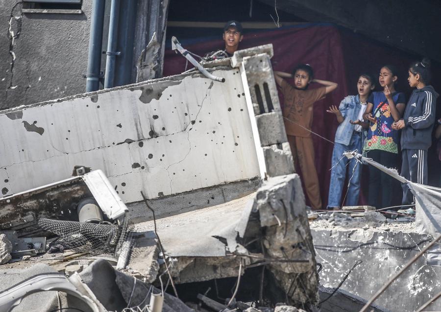 Palestinians are seen at a site of an aid distribution center following an Israeli airstrike in Gaza City, on May 10, 2025. (Photo by Mahmoud Zaki/Xinhua)