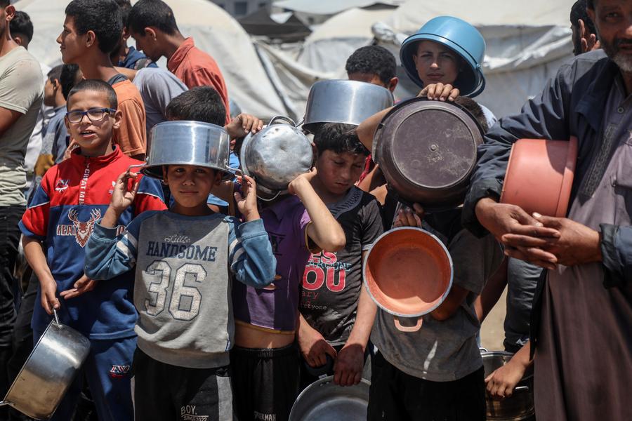 Palestinians wait to receive free food from a food distribution center in Gaza City, on May 9, 2025. (Photo by Rizek Abdeljawad/Xinhua)