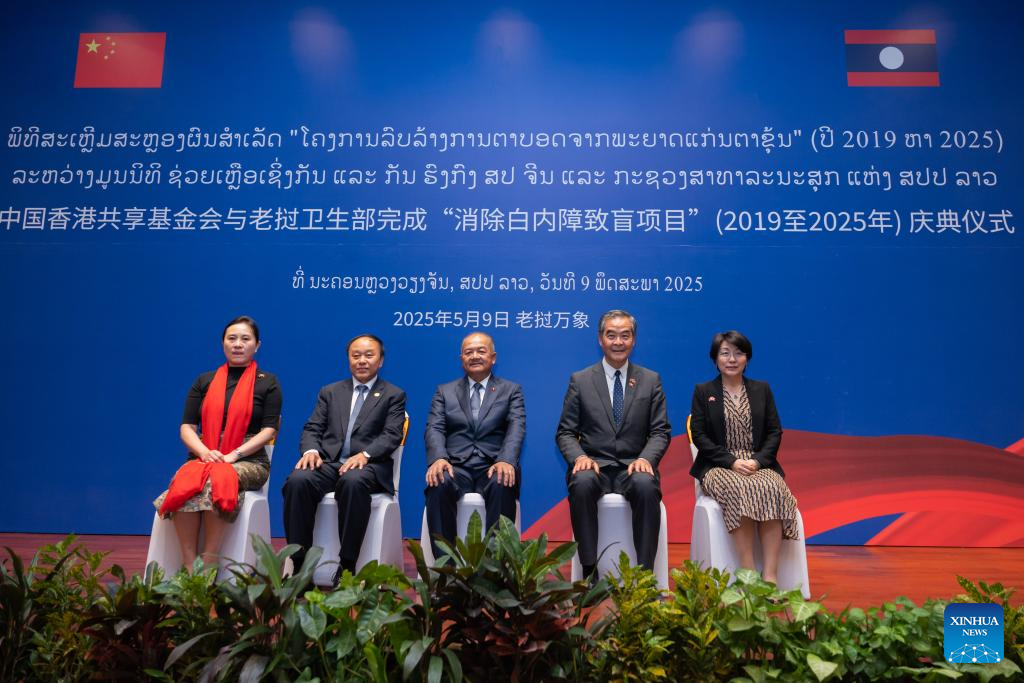 Leung Chun-ying (2nd R), vice chairman of the National Committee of the Chinese People's Political Consultative Conference and chairman of GX Foundation, Fang Hong (1st R), Chinese ambassador to Laos, Kikeo Khaykhamphithoune (C), Lao Deputy Prime Minister, and Bounfeng Phoummalaysith (2nd L), Lao minister of health, attend an event to celebrate the successful completion of the cataract blindness elimination project in Vientiane, Laos, May 9, 2025. Laos' Ministry of Health, in collaboration with China's GX Foundation, has held an event to celebrate the successful completion of the cataract blindness elimination project in Laos. (Photo by Kaikeo Saiyasane/Xinhua)