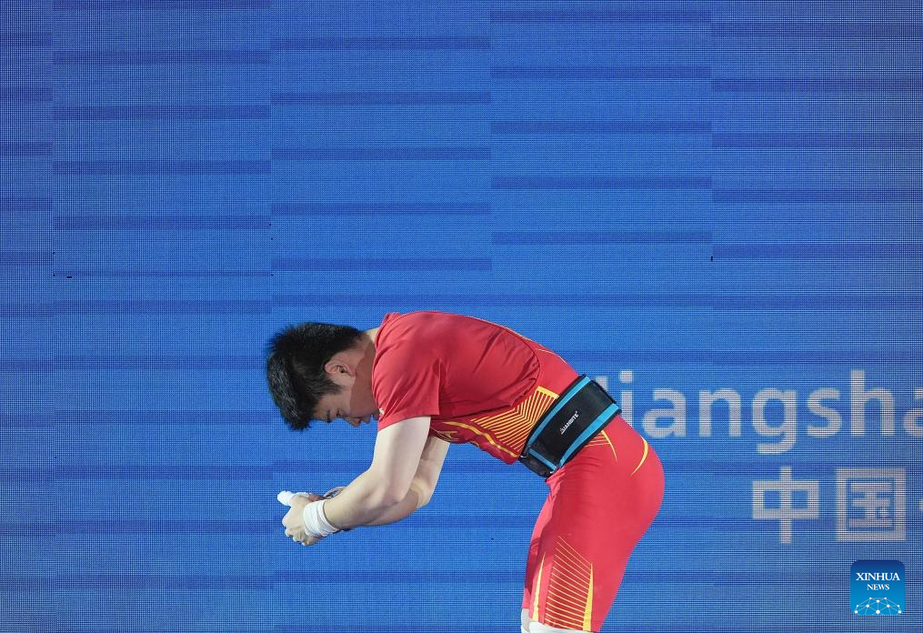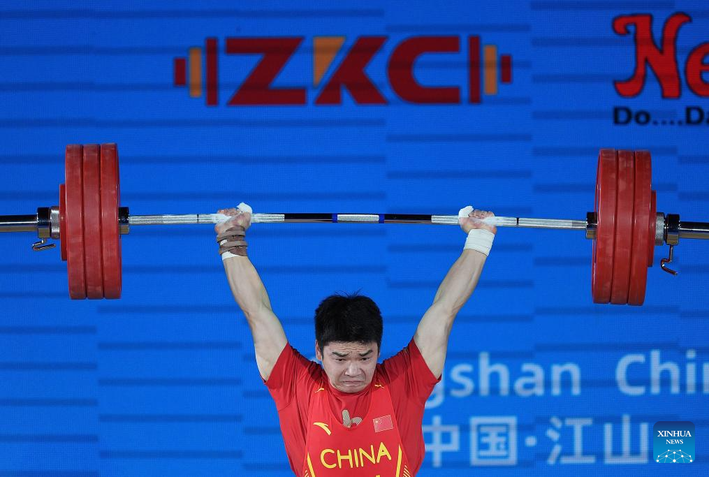 Wu Haifeng of China competes during the men's 73kg competition at 2025 Asian Weightlifting Championships in Jiangshan, east China's Zhejiang Province, May 11, 2025. (Xinhua/Hou Zhaokang)
