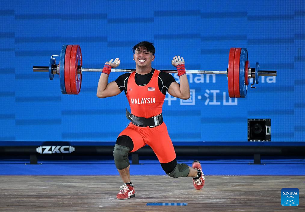 Erry Hidayat Muhammad of Malaysia competes during the men's 73kg competition at 2025 Asian Weightlifting Championships in Jiangshan, east China's Zhejiang Province, May 11, 2025. (Xinhua/Hou Zhaokang)