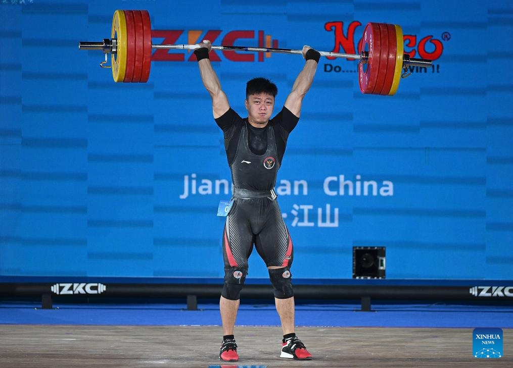 Rahmat Erwin Abdullah of Indonesia competes during the men's 73kg competition at 2025 Asian Weightlifting Championships in Jiangshan, east China's Zhejiang Province, May 11, 2025. (Xinhua/Hou Zhaokang)