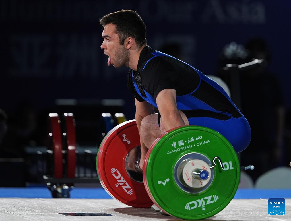Petr Khrebtov of Kazakhstan competes during the men's 73kg competition at 2025 Asian Weightlifting Championships in Jiangshan, east China's Zhejiang Province, May 11, 2025. (Xinhua/Hou Zhaokang)
