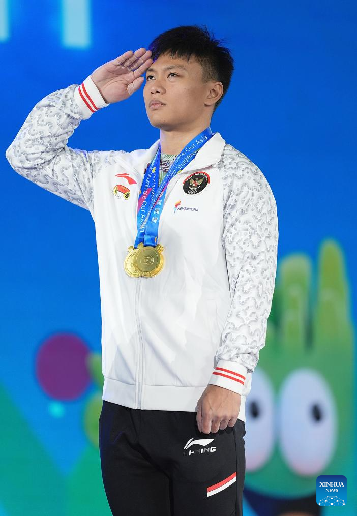 Rahmat Erwin Abdullah of Indonesia reacts during the awarding ceremony for the men's 73kg competition at 2025 Asian Weightlifting Championships in Jiangshan, east China's Zhejiang Province, May 11, 2025. (Xinhua/Hou Zhaokang)