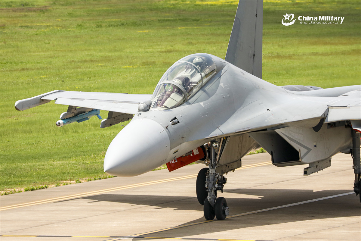 A J-16 multi-role fighter jet attached to an aviation brigade with the air force under the Chinese PLA Eastern Theater Command taxis on the runway during a flight training exercise on April 25, 2025. (eng.chinamil.com.cn/Zheng Hanyi)